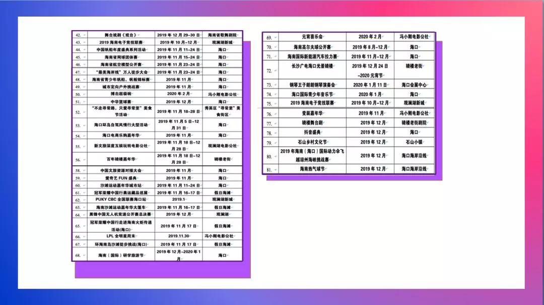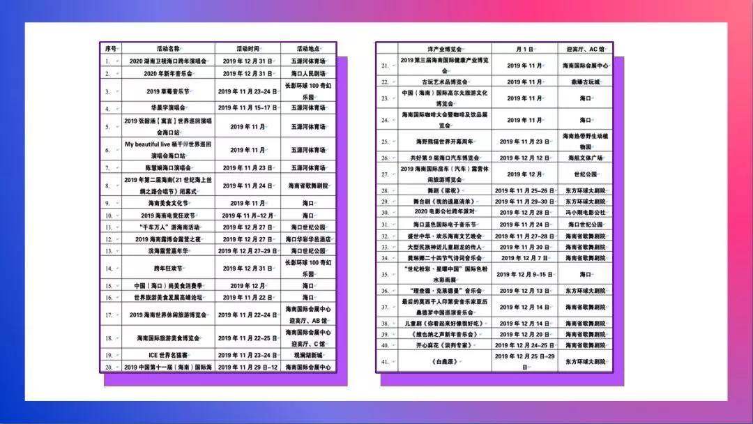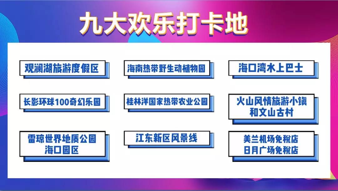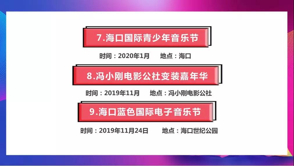 9大狂欢活动。2019海南电竞狂欢节、中华小姐选美大赛、爱奇艺FUN盛典、长沙广电海口光景骑楼等活动将陆续在海口开展。