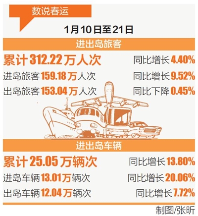 海口1月22日讯 ,记者1月22日从省交通运输厅了解到,2020年春运从1月10日开始,截至21日,春运前12天总体平稳,进出岛旅客总人数略有增长,民航、高铁旅客显著上升,琼州海峡轮渡、道路客运基本持平。