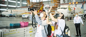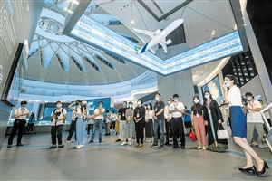 ◀6月8日,在美兰空港一站式飞机维修基地,采风团成员正在采访。 本报记者 陈长宇 摄
