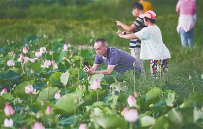 近日,海口市江东大道旁的用本村,上百亩荷花美丽绽放,吸引众多游客前来观赏游玩。图❶为傲然绽放的荷花。图❷为游客观赏荷花,拍照留念。本组图片均由本报记者 封烁 摄
