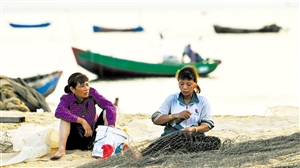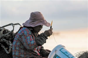 ①渔民在修补渔网。