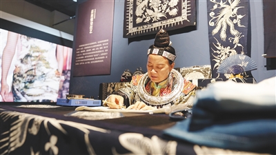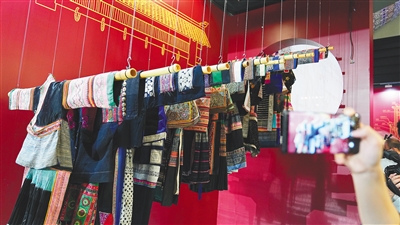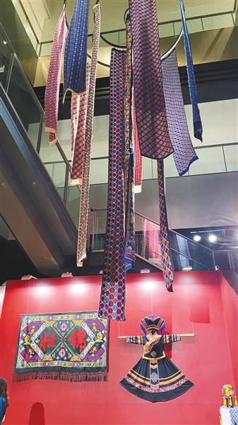 在锦绣海南板块,海南师范大学美术学院策展团队通过辅以声光电等形式,完整还原黎族传统纺染织绣四大技艺,现场陈列既有龙被这样的传统黎锦精品,又有创新黎族服饰。