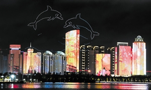 ▶10月2日晚,海口万绿园继续举行无人机光影秀表演。 本报记者 黄一冰 摄