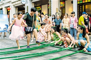 ▲10月2日下午,游客在海口骑楼老街体验竹竿舞。 本报记者 陈长宇 摄
