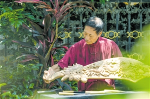 龙塘雕刻传承人王科美正在制作木雕作品。 本报记者 康登淋 摄