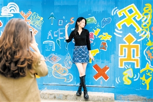 ▲游客在898艺术村墙绘前拍照留念。本报记者 陈长宇 摄
