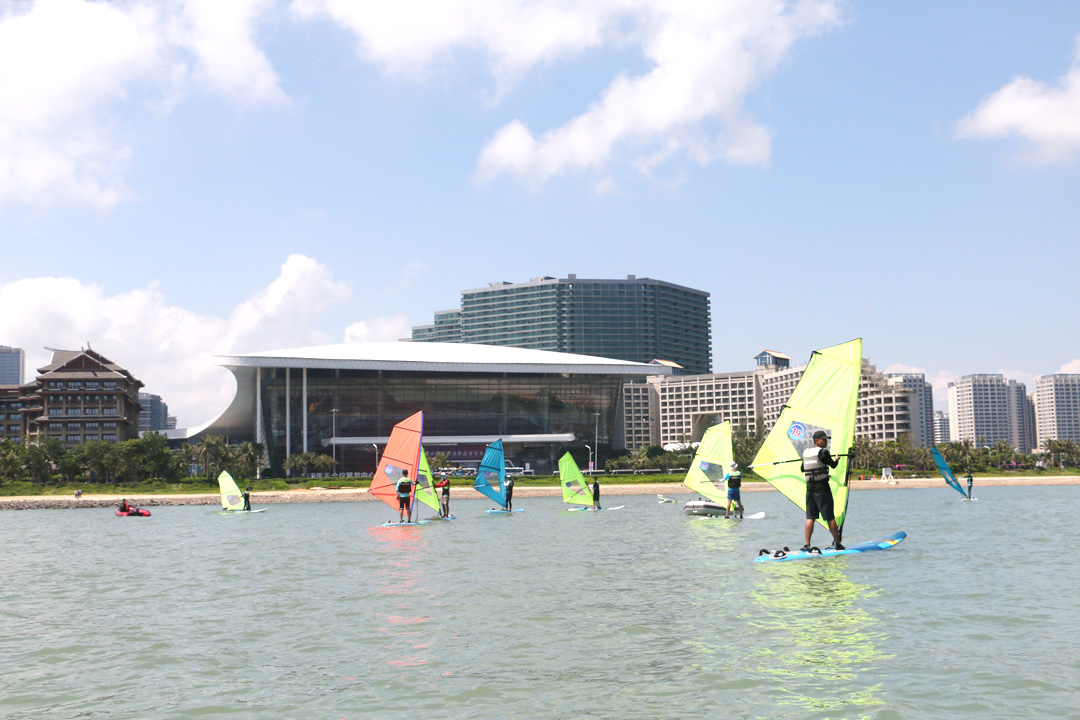 海面上彩帆飞扬,运动健儿们乘风逐浪,大显身手,在海上驰骋的身影,与蓝天、大海、椰树......相互映衬,构成一幅壮阔的滨海美景,吸引不少人驻足观看。