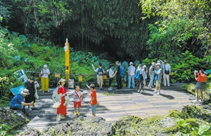 随着暑期旅游季的到来,海口火山口公园里万年前的火山、千年的火山石文化和热带生态植被群落吸引了众多孩子前来游玩。