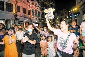 7月30日,“相约消博游龙华”主题活动在海口骑楼老街举办。图为活动现场,市民游客在中山路上随着音乐节奏尽情起舞。 本报记者 康登淋 摄