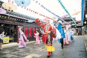 伴随着音乐,身着唐装、汉服、cosplay服装的演员沿着古香古色的小路翩翩起舞,优雅的舞姿引得游客驻足观看并举起手机拍摄记录,人群中不时传出欢呼声和鼓掌声,现场气氛热烈。