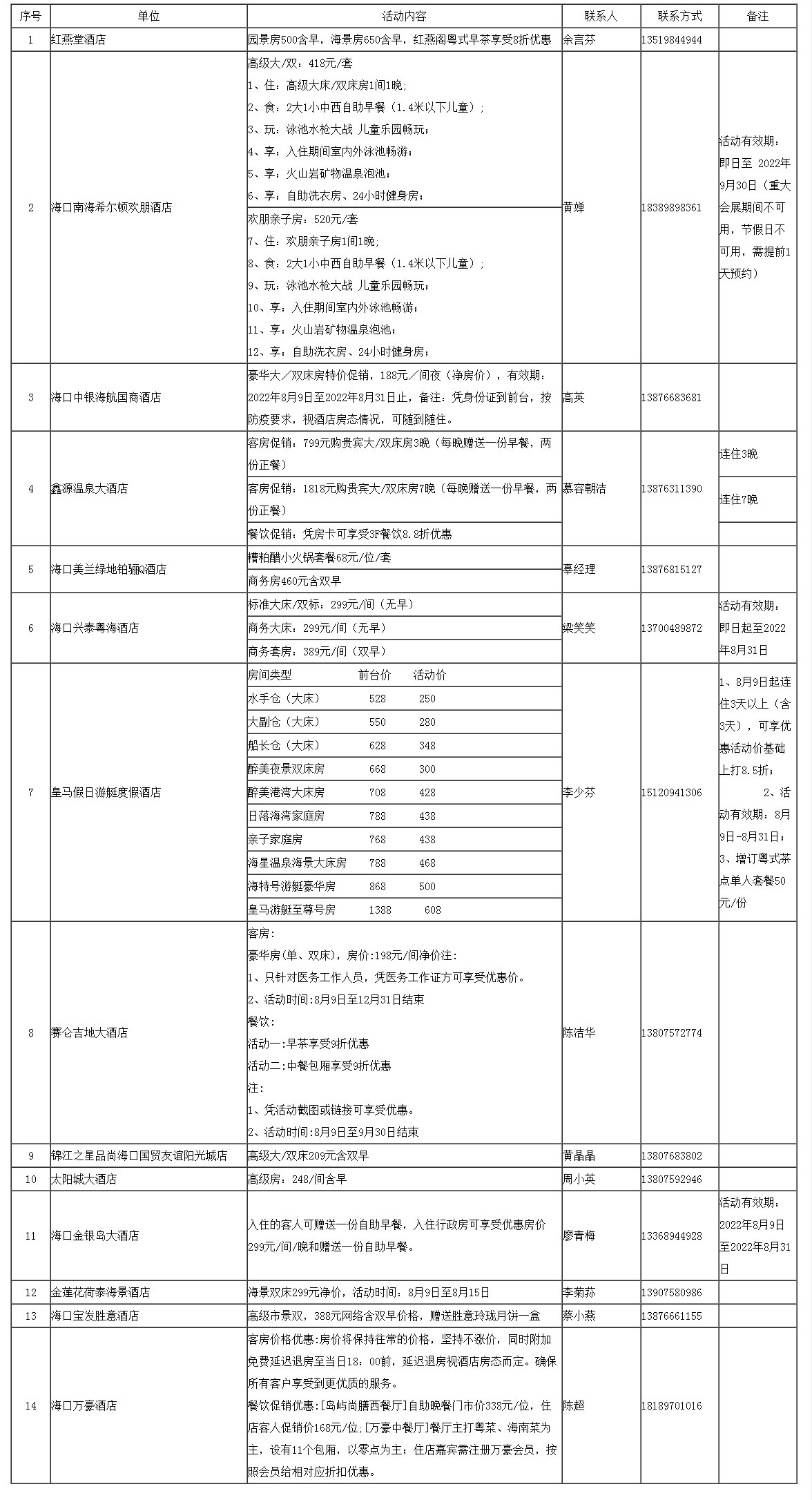 为做好停留在海口的游客住宿问题,努力为广大游客朋友提供最周到、最暖心的服务。经市旅文局、市酒店协会号召倡议,我市14 家酒店积极响应,为滞留游客推出酒店优惠组合套餐,酒店将以温暖热情的服务迎接您的到来。现将住宿酒店名录公布如下,请需要住宿的游客自行选择。