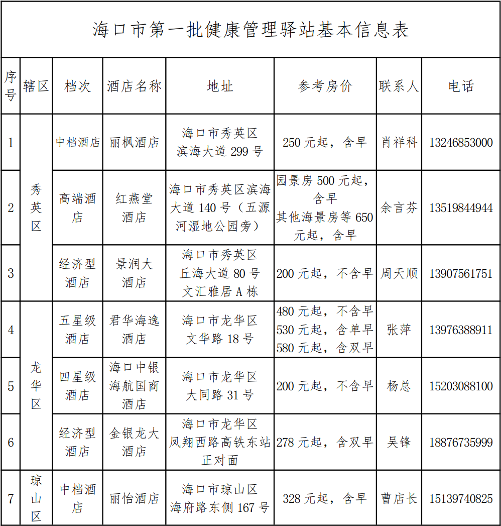 为切实保障因疫情滞留的旅客安全有序返程,严防疫情外溢,根据8月12日公布的《关于完善滞留旅客经港口返程防控措施的补充通知》、《关于滞留旅客从港口码头火车站离岛的通告》,我市为拟从港口码头、火车站离岛的旅客准备第一批健康管理驿站,现将驿站基本情况公布如下: