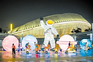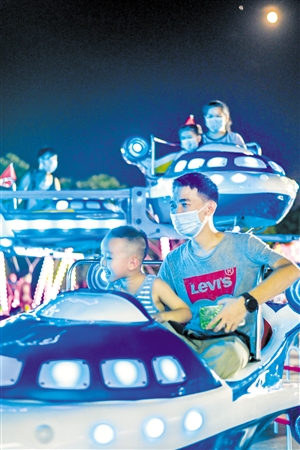 ▲9月11日晚,海口市五源河潮玩市集上,明月当空,市民游客正在体验旋转飞机游乐设施。 本报记者 石中华 摄