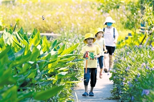 ▲9月12日,海口美舍河凤翔湿地公园,小朋友步入人工梯田欣赏美景。 本报记者 石中华 摄