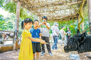 ▲9月12日,在海南热带野生动植物园,小朋友正在与羊驼互动。 见习记者 孙士杰 摄