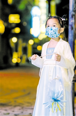 ▲9月10日,海口观澜湖冯小刚电影公社,小朋友身着古装手提花灯夜游。 本报记者 康登淋 摄