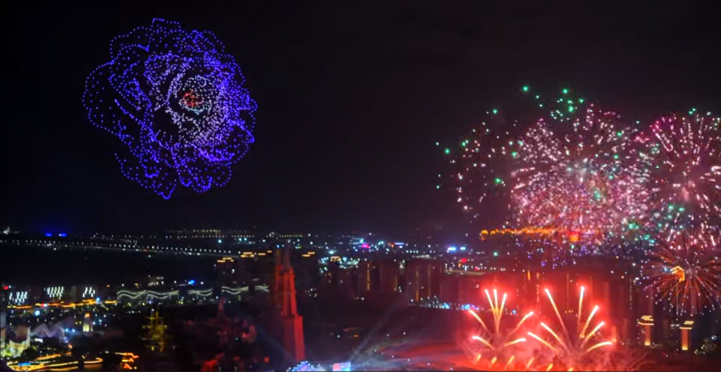 多首曲目的高空烟花,数千架无人机将浪