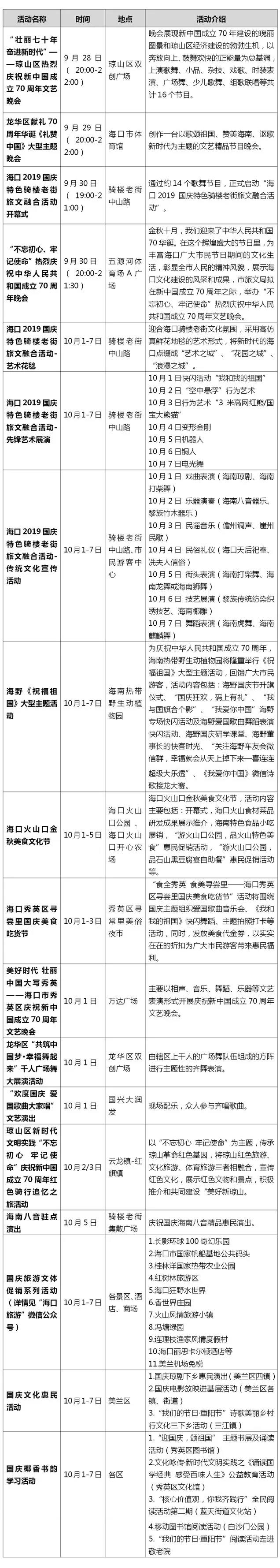 2019年国庆海口旅游文体活动一览表