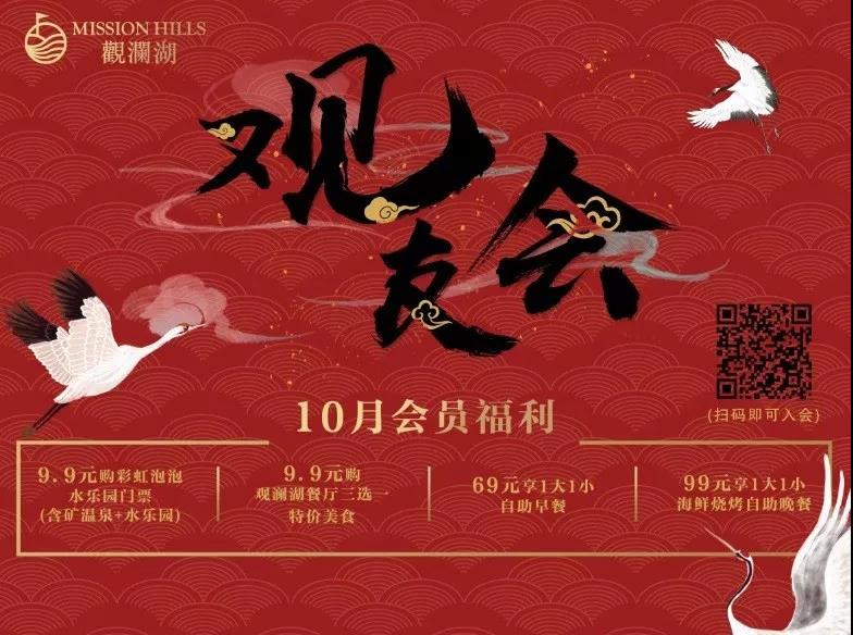 成为海口观澜湖观友会会员,即享9.9元温泉及水上乐园门票1张(限购一份)、9.9元享三选一特价美食(限购一份)、69元享观澜湖自助早餐1份(限购两份)以及99元享观澜湖自助晚餐1份(限购两份);此外国庆期间还有会员抽奖、水世界门票免费送的惊喜福利等着大家!
