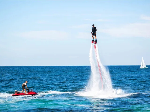 水上飞板实际上是一双两脚连在一起的水上“飞行靴”。飞行靴上有喷射装置,可以将水射出,所产生的动力足以推动使用者离开水面。由于新奇炫酷,这项叫“水上飞板”的新兴运动广受海内外无数年轻人的追捧。
