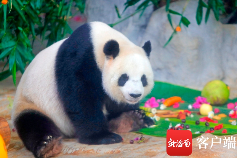 在一片欢呼声中,熊猫舜舜踱步而来,走向精心备好的“零食区”,已经适应海南生活的熊猫兄弟,不仅吃得“膘肥体壮”,还学会了喝椰子。据工作人员介绍,椰子水清甜可口,熊猫兄弟来到海南后,也学会了吃椰子。