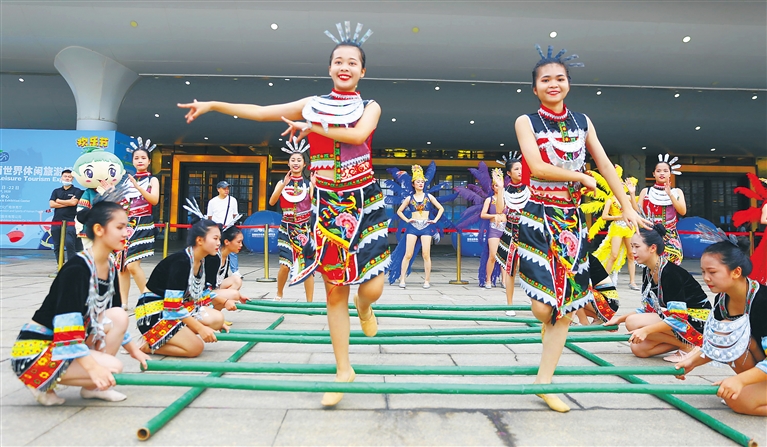 11月20日,在海南国际会展中心,竹竿舞表演举行,展示海南文化魅力,为2020年海南国际旅游岛欢乐节增添欢乐氛围。 本报记者 张茂 摄