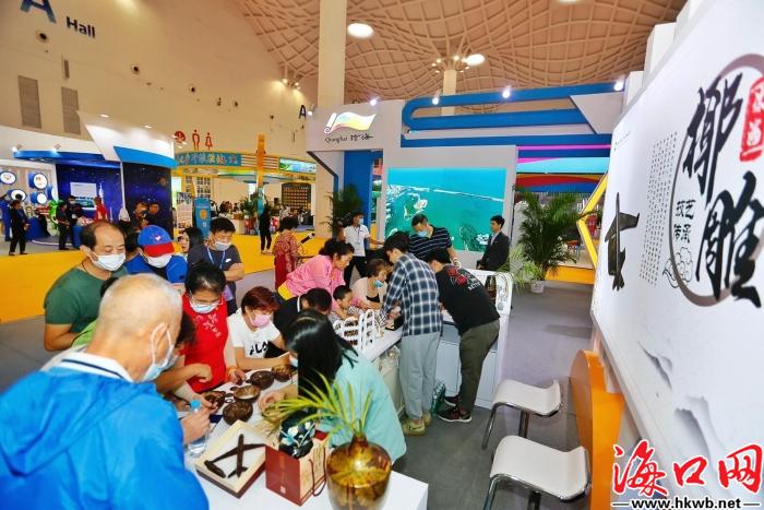 海口网记者在现场看到,参展商在各自的展区、舞台区等处,开展多场精彩的文艺汇演、民俗舞蹈、旅游推介等活动,营造热烈的逛展氛围。海南爱心椰文化有限公司开展了免费椰雕DIY体验,让更多市民了解并喜欢海南椰雕,同时加入到保护本土优秀传统文化行业中。现场,在工作人员的协助下,参与市民在一块小小的椰壳上刻出图案。“非常有趣,而且这是一个细致活儿,非常考验耐心。”市民李颖说。