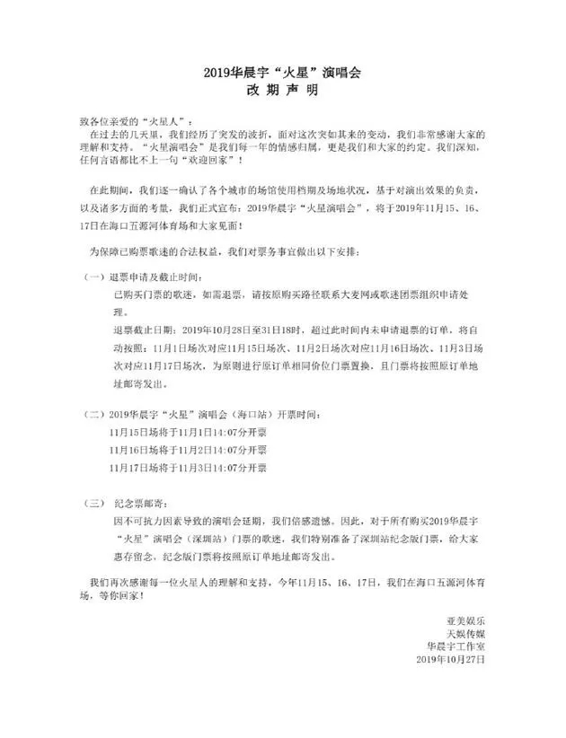 2019年的火星演唱会其实经历颇多波折,10月22日晚,华晨宇工作室官方微博发布声明,宣布原定于在深圳举行的华晨宇2019火星演唱会因不可抗力延期。