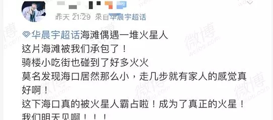 在微博华晨宇超话上,这两天粉丝的热门话题是感叹在海口怎么遇到那么多“火星人”。