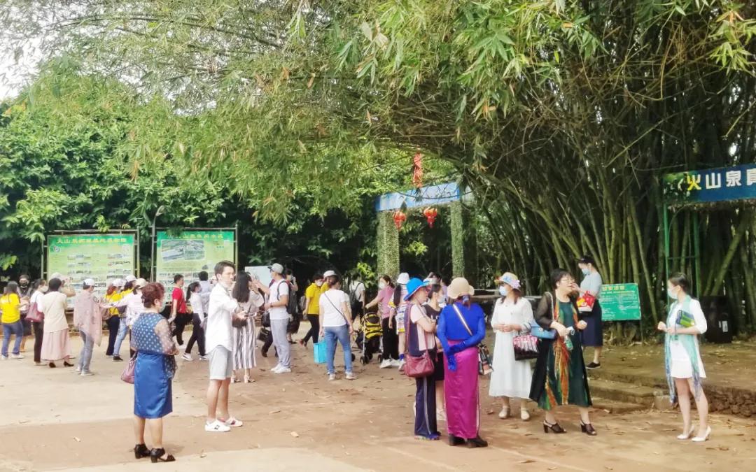 正午时分, 当自驾车驶入火山大道边的火山泉休闲农庄时,发现宽大的停车场,竟然“一位难求”。不时有装载着游客的大巴车也驶了进来,下车的乘客戴着口罩,在组织者的提示下站好队形,明确防疫注意事项后,入园参观并用餐。