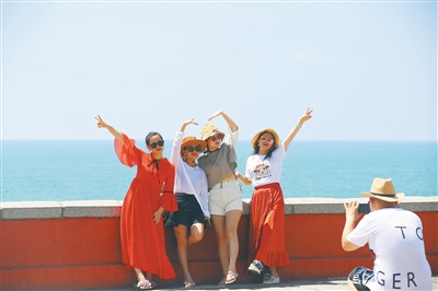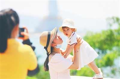 5月19日,在三亚南山文化旅游区游览,游客以碧海蓝天为背景,拍照留念。 本报记者 武威 特约记者 陈文武 图/文