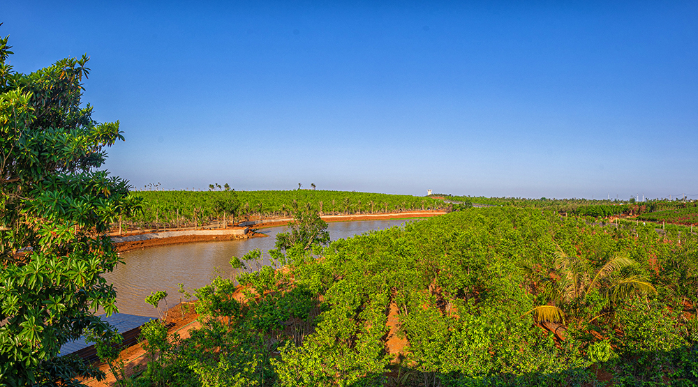 农庄内沉香种植占地800余亩,采取“企业+基地+合作社+农户”发展模式,带动周边村民种植沉香并提供就业岗位。规模化培育海南本土黄油格白木香树2万余株、人工培育珍稀奇楠品种20万棵,并配套现代化日光温室大棚、精油与线香加工车间、香文化展厅,实现种植、加工、展销全链条发展。林间复合种植莲雾、荔枝等热带果林,结合湖畔垂钓区与萌宠乐园(鸵鸟、蒙古马、夏洛莱黄牛),构建“林下养殖+生态旅游”绿色循环模式,形成多元生态景观。