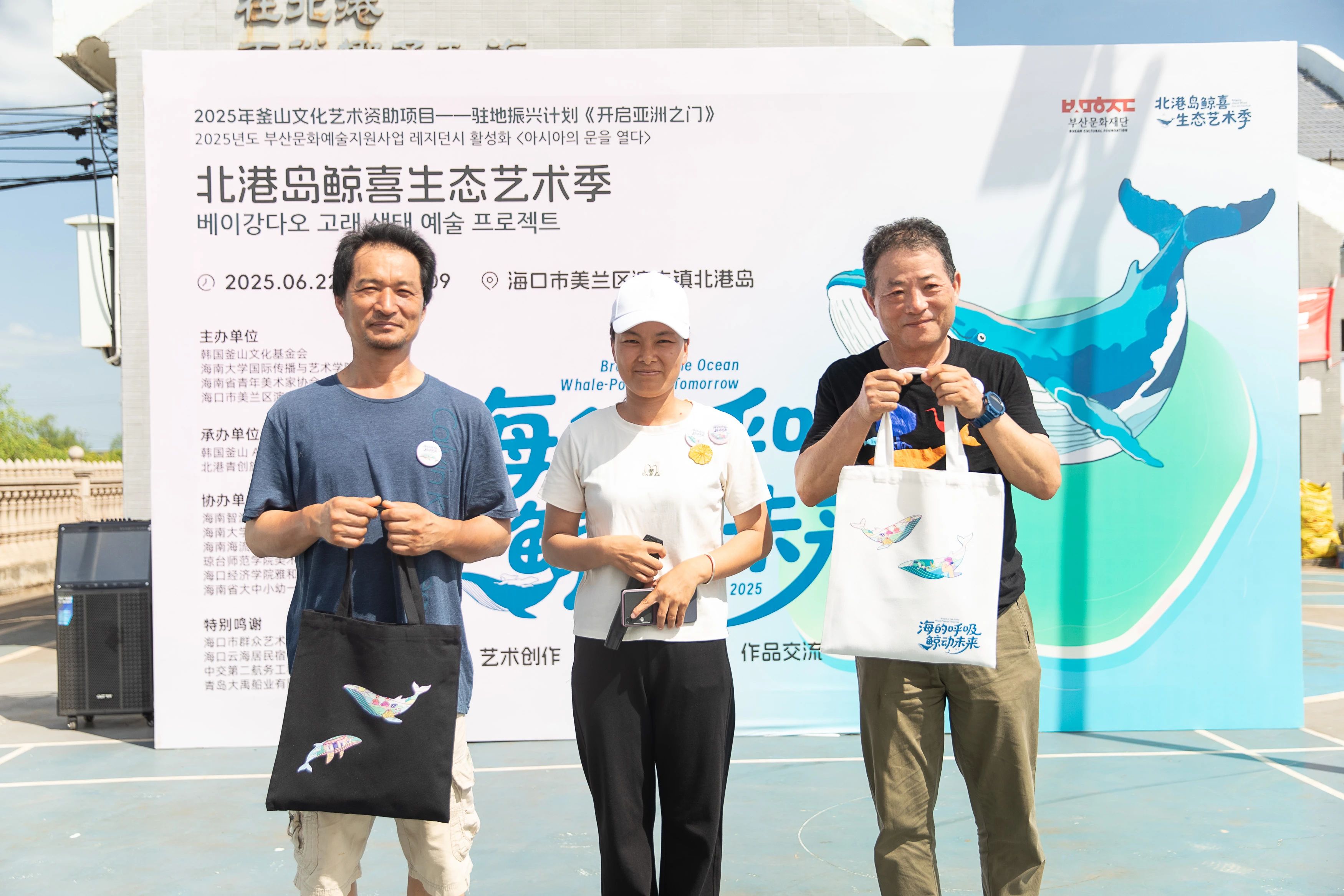 闭幕式上,韩国艺术家代表秦荣燮、海南艺术家代表云维英,以及北港村党支部书记、村委会主任陈奕虎等分别致辞。随后,依次举行了捐赠仪式。四位村民代表将亲手设计的北港文创T恤赠送给八位韩国艺术家,并讲述了这期间跟着秦荣燮教授学习艺术手工创作的经历与感悟,表示了感激之情;而韩国艺术家也将在地与村民共创的艺术作品捐赠给村里,传达共同创作的喜悦,象征跨国友谊的延续。