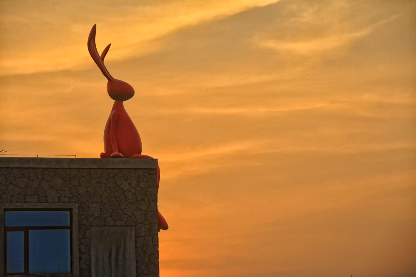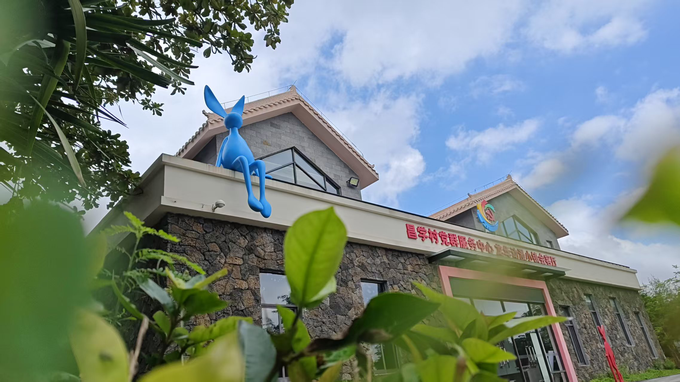 昌学首个IP虚无兔:一红一蓝两只3米高巨兔踞坐火山岩房屋之巅,萌系造型与古朴石墙碰撞出超现实视觉奇迹——您的朋友圈爆款封面就靠它!