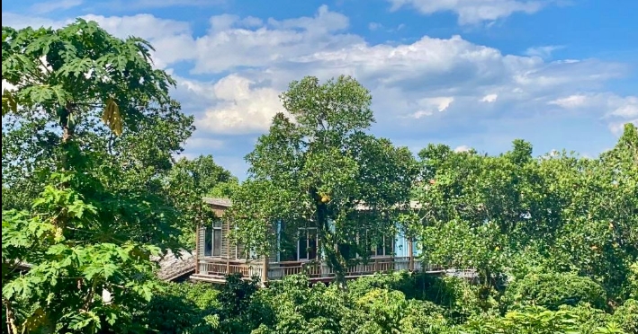 民宿坐落于海口市火山口公园附近的“荔枝花海”内,周围环境幽深,植被覆盖丰富,荔枝、菠萝蜜、杨桃、椰子应有尽有。