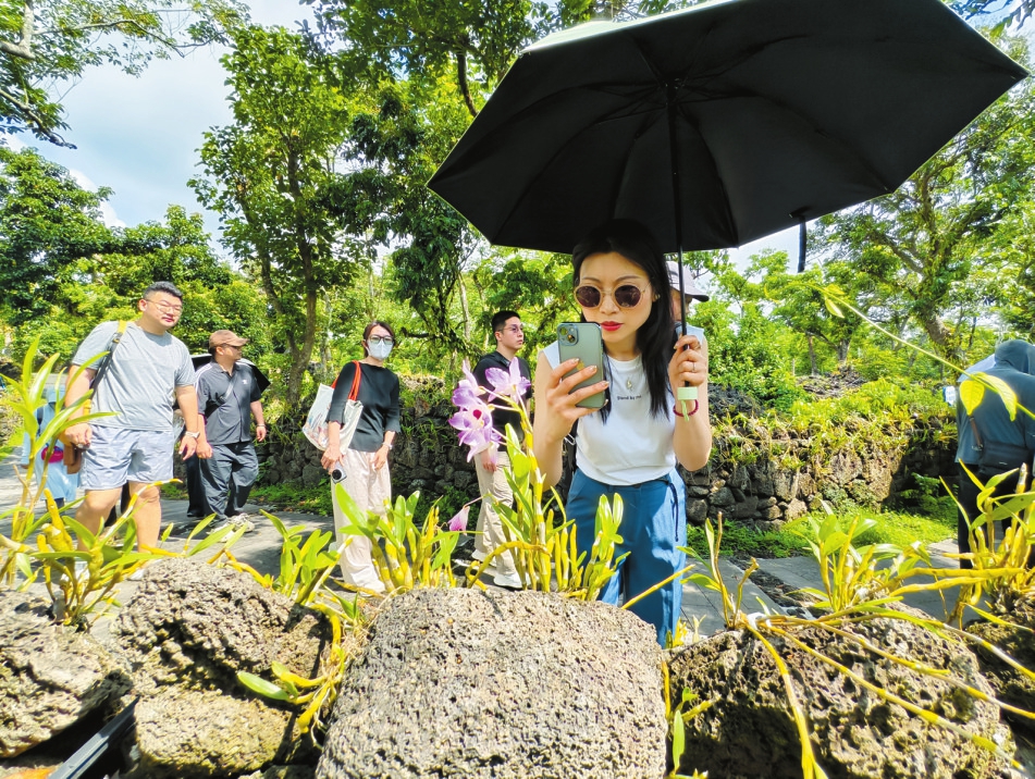 在石山镇施茶村的火山石斛园内,游客拍摄盛开的石斛花。本报记者 石中华 摄