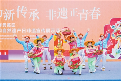 有苗村的村民背着茶筐唱小调、采茶叶;有海边的渔民织渔网、唱哩哩美;有黎寨的男人背着耕犁、牵着由人扮演的“牛”在劳作;也有村民进行舞龙、舞狮、琼剧、人偶剧、公仔戏、盅盘舞等非遗节目表演。