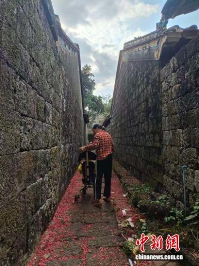 步入东谭村,火山石院落青瓦石墙,颇有古韵。 中新网记者 张茜翼 摄