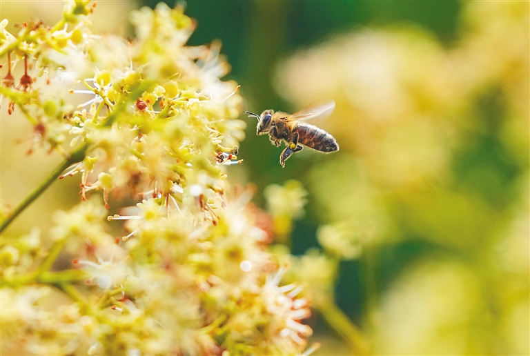 走进海口市秀英区永兴镇儒成村的荔枝林,可以看到无数小精灵“嗡嗡”飞舞在荔枝花从中。在荔枝花期,最忙碌的可能就是这些勤劳的蜜蜂了。
