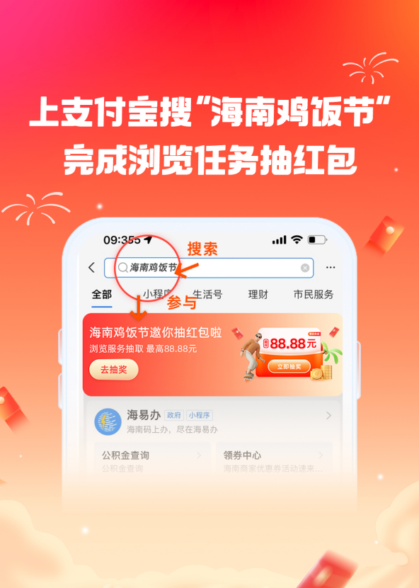 鸡饭节期间,市民游客可通过支付宝瓜分首届海南鸡饭节2万份现金红包,上支付宝搜【海南鸡饭节】或【海易办】,到活动页面完成浏览任务即可领取,最高金额88.88元。