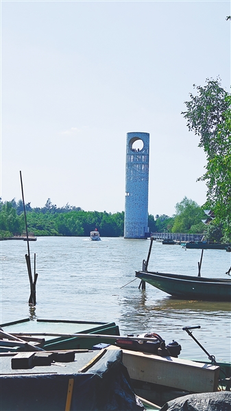 与所见惯的那些汹涌澎湃的、开阔无垠的大海不同,此处的海显得安静,显得局促,像打了败仗的将军,像泄了气的皮球。是的,谁又能在绵延不尽、迎风挺立的红树林面前张狂呢?人们称赞红树林为“海上绿色长城”,它们防风消浪、固堤护岸,还为海边的鸟类、鱼虾提供栖息繁殖场所,守护万物生灵,也包括人类的家园。