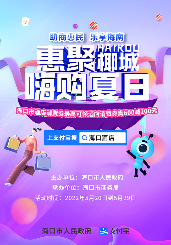 5月20日,海口在支付宝发放酒店消费券 满600减200,满400减150,满200减50 先到先得!数量有限! 请在支付宝搜索"海口酒店" 跳出领取页面,就可以 三选一,选一张进行领取 活动期间,每人限领一次!