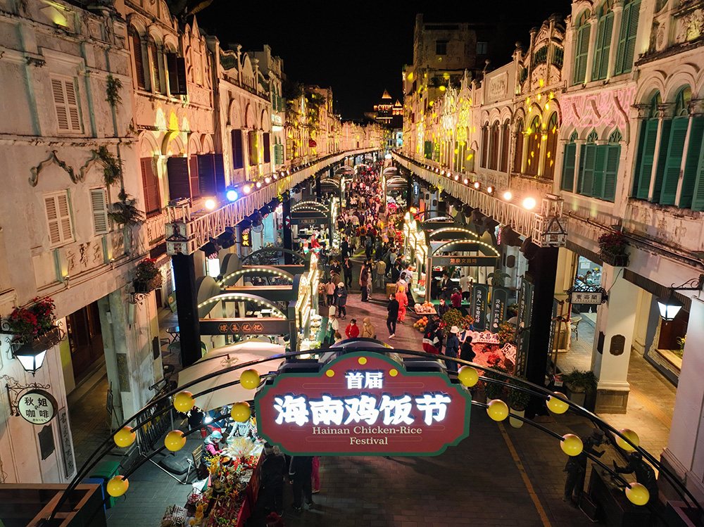 漫步在骑楼老街,可以一边品尝海南鸡饭美食、购买海南特色旅游商品,还能欣赏情景表演,沉浸式感受海南美食文化的乐趣与内涵。