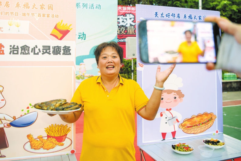 6月22日下午,“我们的节日·端午节”百家宴活动在美兰区三联社区亮肚村举行,在厨艺比拼的展示环节,村民正在开心地向来宾介绍自己刚做好的菜品。 本报记者 陈长宇 摄