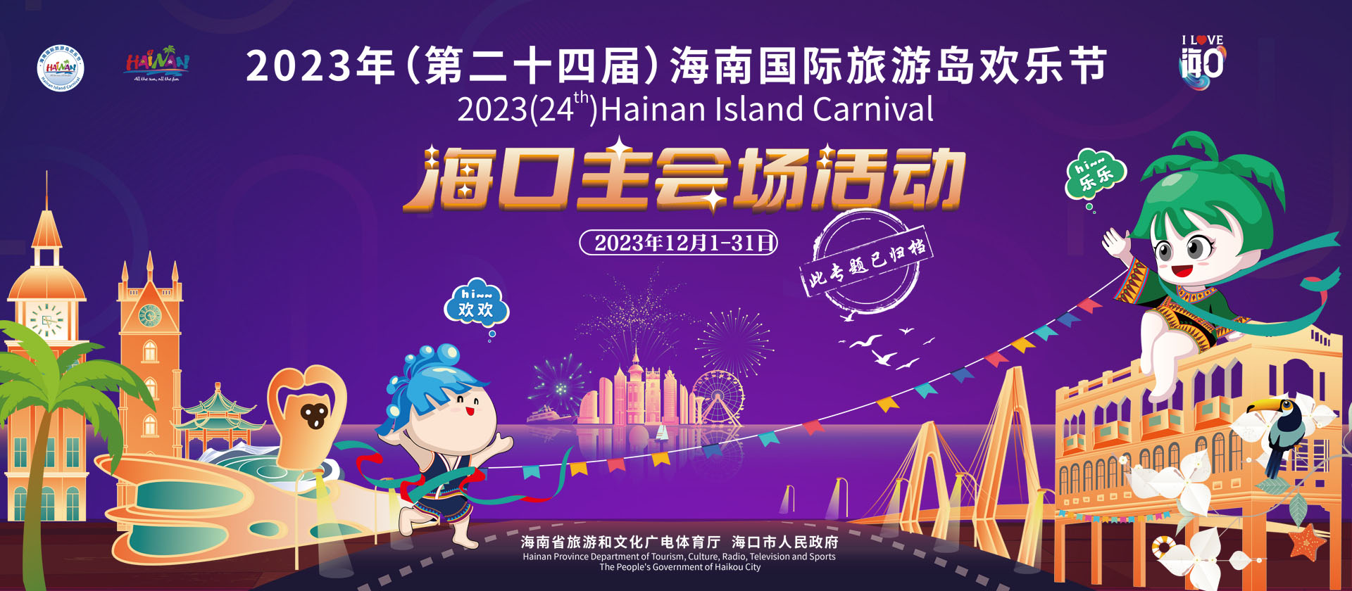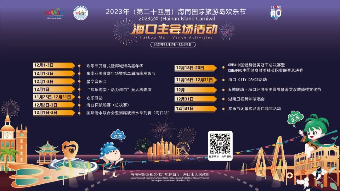 2023年(第二十四届)海南国际旅游岛欢乐节闭幕式及海口跨年嘉年华、湖南卫视跨年晚会、海口新年音乐会、登高迎新、电音派对、国潮非遗、街艺快闪、免税优惠......