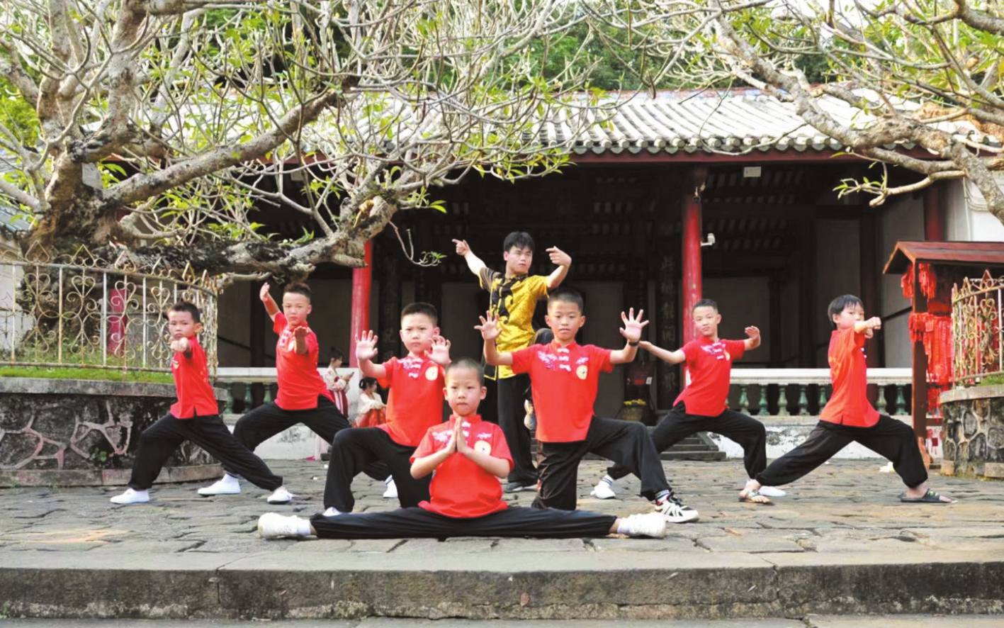 在祠堂广场,海南省国文武术研究院带来的太极拳方阵表演,同样吸引了不少市民游客的围观,表演者以太极拳方阵置广场处展示传统套路招式,展现中国传统文化中对宇宙和生命的理解和认识。尚武精神,是泱泱华夏数千年的文化传承,由中华武术励志教育基地的教练和孩子们用铿锵有力的武术表演,展示了中华民族自强不息的民族气概。