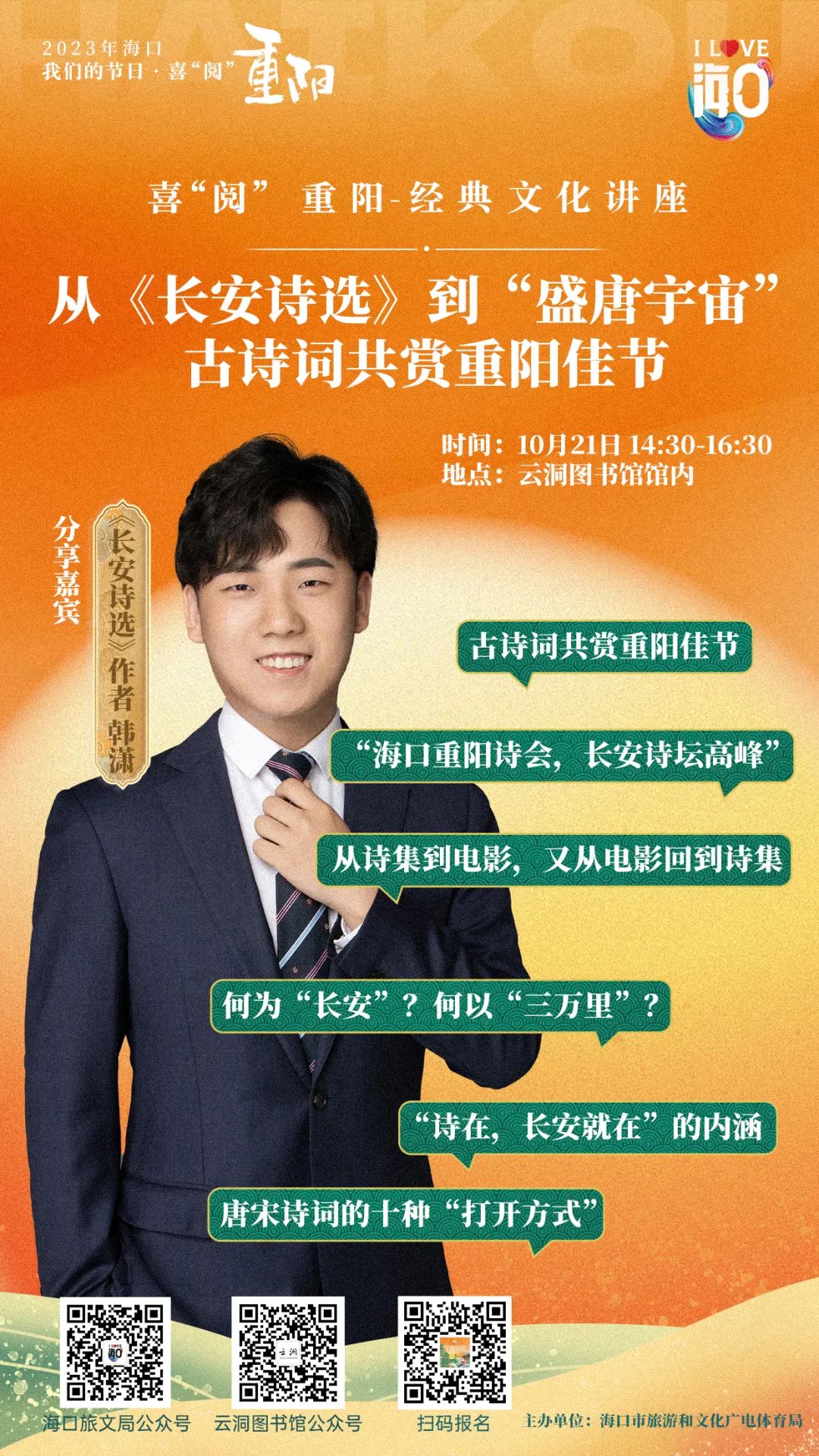 为了迎接重阳佳节的到来,营造“书香海口”的文化氛围,10月21日,《长安三万里》电影官方授权图书《长安诗选》作者韩潇将空降椰城,在云洞图书馆馆内开启一场别开生面的作者分享会,带领朋友们重新认识李白、高适、杜甫、王维等诗人及其精神世界,并就诗选中的重阳节相关诗句进行分享与解读,从千古名篇中感受诗意之美和大唐气象。见面会现场还将有古色古香的国风节目演绎,凭诗意通古今,前来现场感受独属中国人的极致浪漫吧。