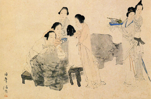 在故宫博物院,收藏着一幅名为《乞巧图轴》的古代人物绘画作品,其作者是著名的清末海派画家任伯年。图中描绘了农历七月初七这一天,一群青年女子在月夜下围聚石案周围,用一枚绣针投入一只水碗中,以此进行“卜巧”“乞巧”等民俗活动。