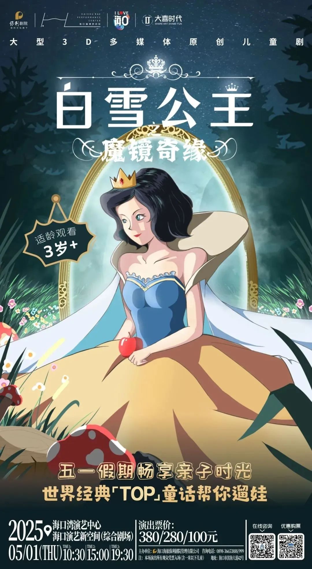 “五一”期间,在海口湾演艺中心多台精彩剧目将先后亮相,大型3D多媒体原创儿童剧《白雪公主之魔镜奇缘》、《暮光之城》电影金曲烛光音乐会、《波西米亚狂想曲》跨时空:经典与流行主题烛光音乐会、沉浸互动推理喜剧《疯狂理发店》等不同种类的优质剧目轮番演出,丰富市民游客的娱乐体验。