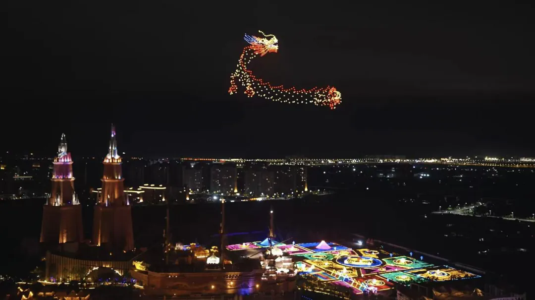 5月31日,在海口长影环球100奇幻乐园,无人机摆出的精美图案颇受市民游客青睐。本报记者石中华摄5月31日端午假期首日,海口一系列文旅活动轮番上演,点燃了整座城市的节日激情,也为海口文旅市场注入了强劲